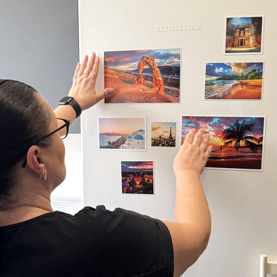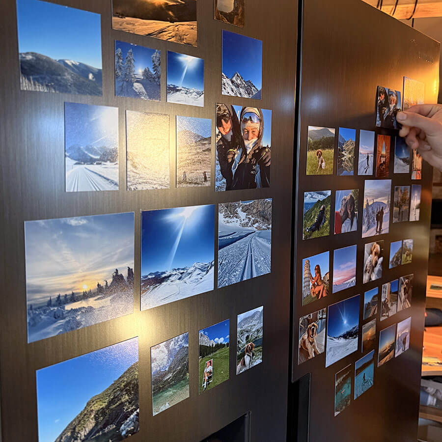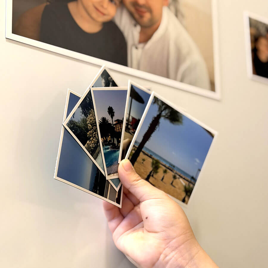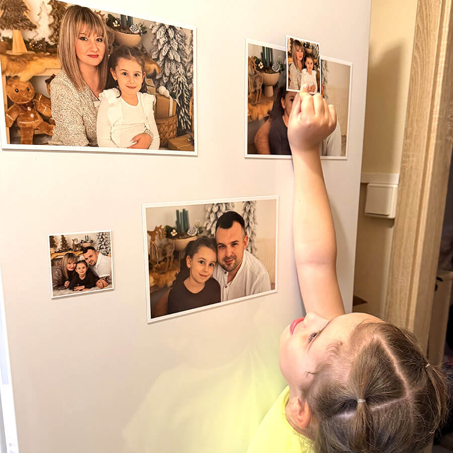 Wszystkie magnesy fotograficzne produkujemy z cienkiej, elastycznej folii magnetycznej, która nie tylko dobrze trzyma się lodówki, ale także potrafi dopasować się do jej delikatnych krzywizn. Nasze magnesy są jednocześnie sztywne i giętkie, a dzięki wysokiej jakości papierowi fotograficznemu wyglądają po prostu świetnie. Nie musisz niczego instalować ani skomplikowanie przycinać. Prześlij zdjęcia bezpośrednio z telefonu, a my zajmiemy się resztą.